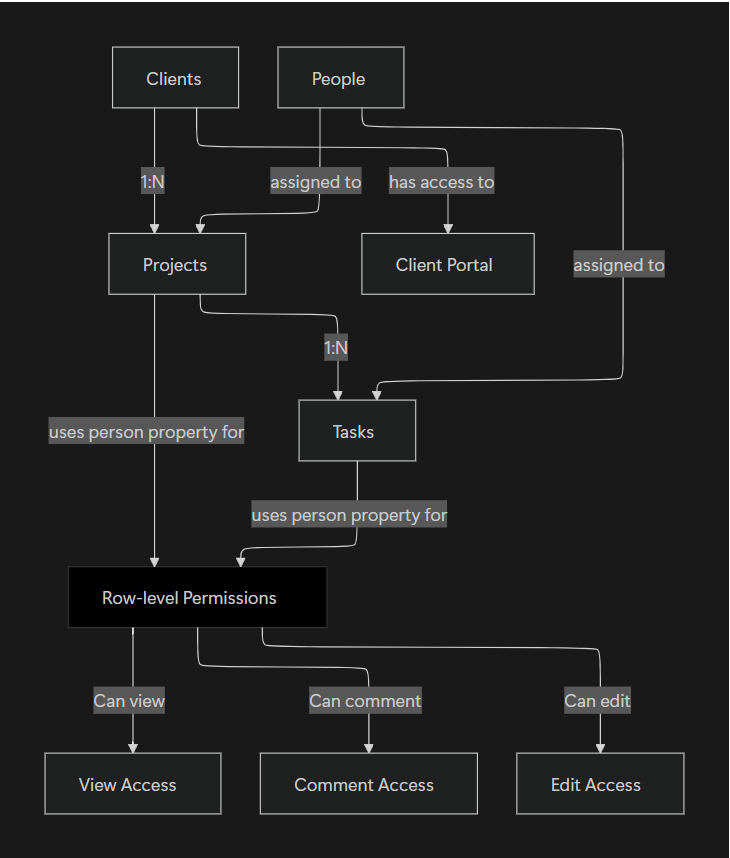Finally, we create a page-access rule on the “Projects” data source. Anyone in the “Client users” property get editing/commenting/viewing access (pick your most suitable option). This ensures that whenever we create a project for our client, they will see it on their dashboard immediately and automatically.