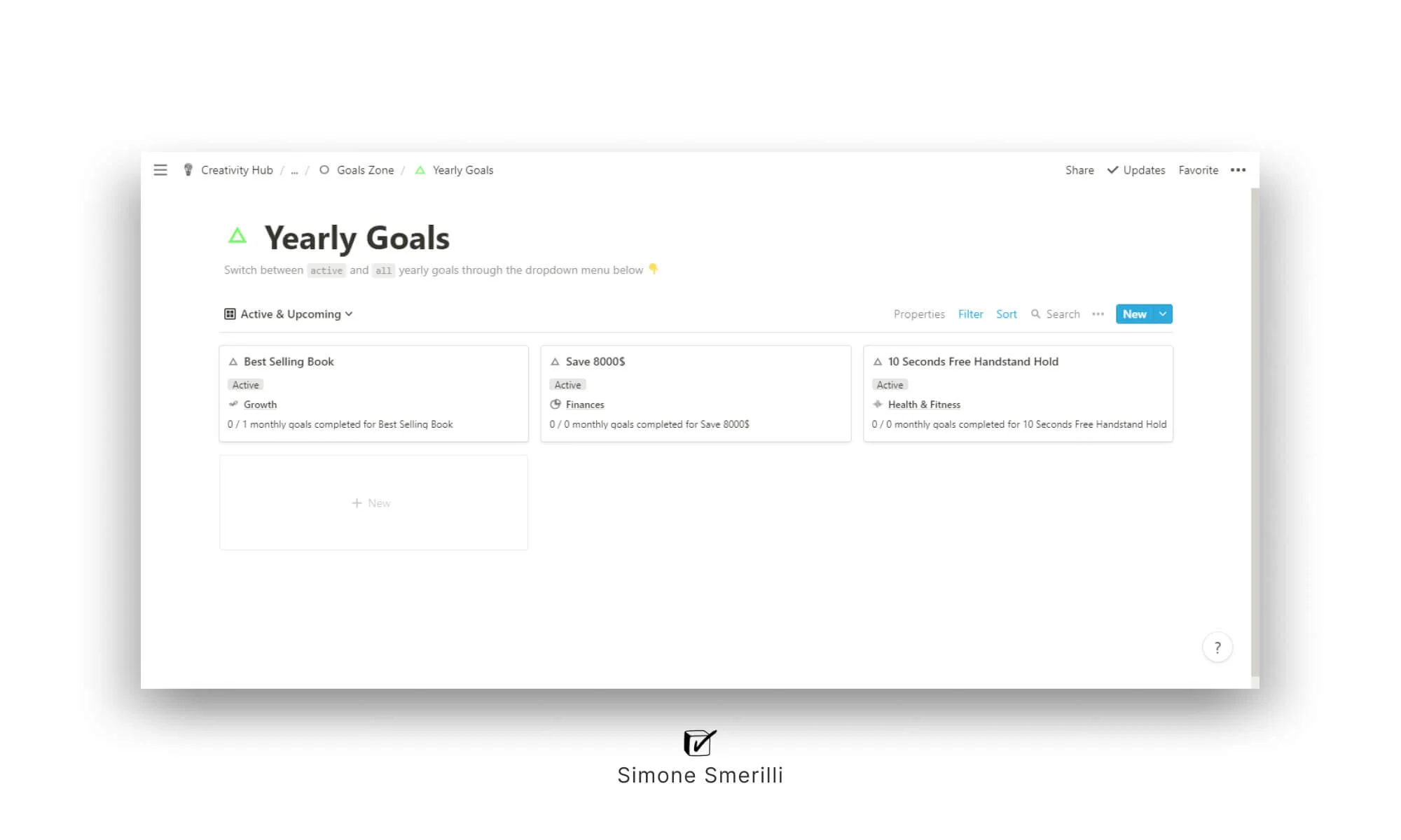 The Yearly Goals database is the second fundamental step in the process of precise goals setting. Where do you see yourself in one year? What are the concrete, attainable goals you want to achieve in one year? Your answer to these questions must be written in the yearly goals database. Each objective is associated with an area. Each yearly goal will also be linked with multiple monthly goals and milestones. These relations allow us to be very precise in what we intend to achieve, which can feel uncomfortable. Deploying cognitive energy to figure out what it is we truly want to attain can be frightening and rewarding at the same time. Visualizing your actual life direction is frightening because you may—and probably will, to some degree, become aware of your failure, or your success for that matter. Being conscious of failure is scary to many of us. But what generates Resistance may be worth exploring further. We aim at setting objectives and being emotionally detached from them. In daily practice, we want to focus intensely on the habits and processes that will lead us to inevitably achieve the goals we set. It is consistency and deliberate practice that makes the difference.