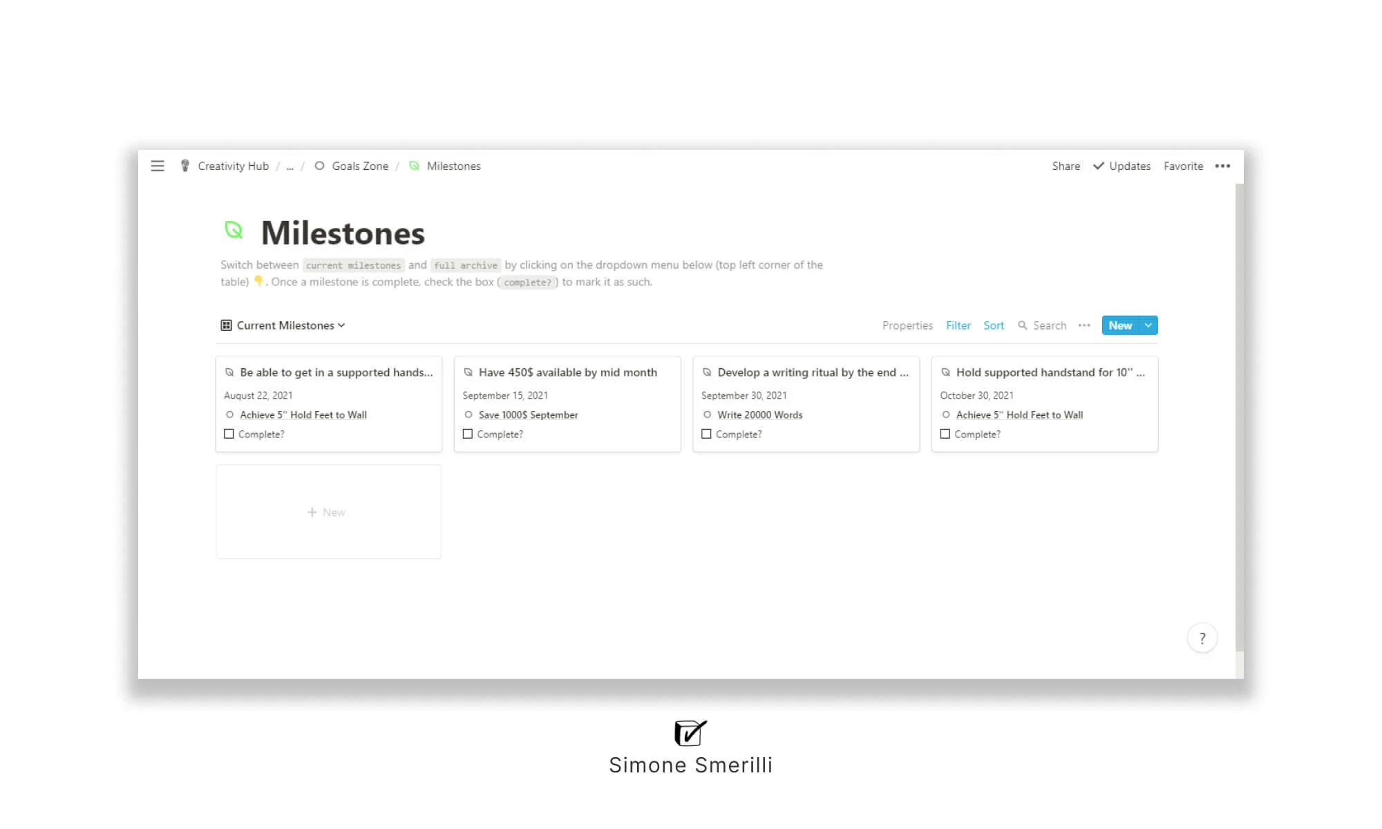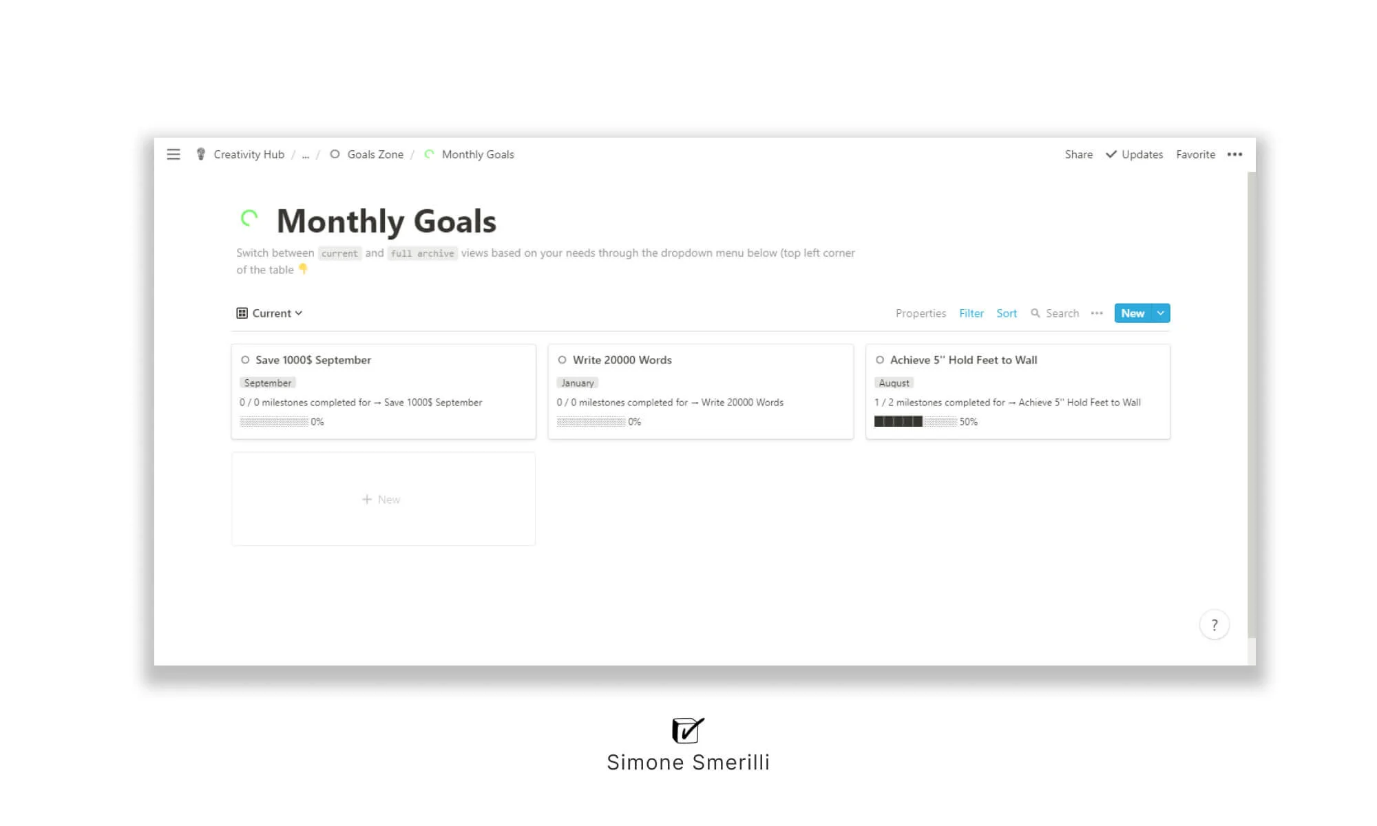 After defining yearly targets, we will reduce the time scope of our goals and set up monthly goals. These objectives are more immediate, manageable, achievable. Every yearly goal will have multiple monthly targets associated with it. The Monthly Goals Notion database also allows seeing visual progress on any given goal. That is thanks to milestones, even more immediate and realistic practices that will lead us to success daily. Milestones are the very next step of this Notion Goals Setting system.