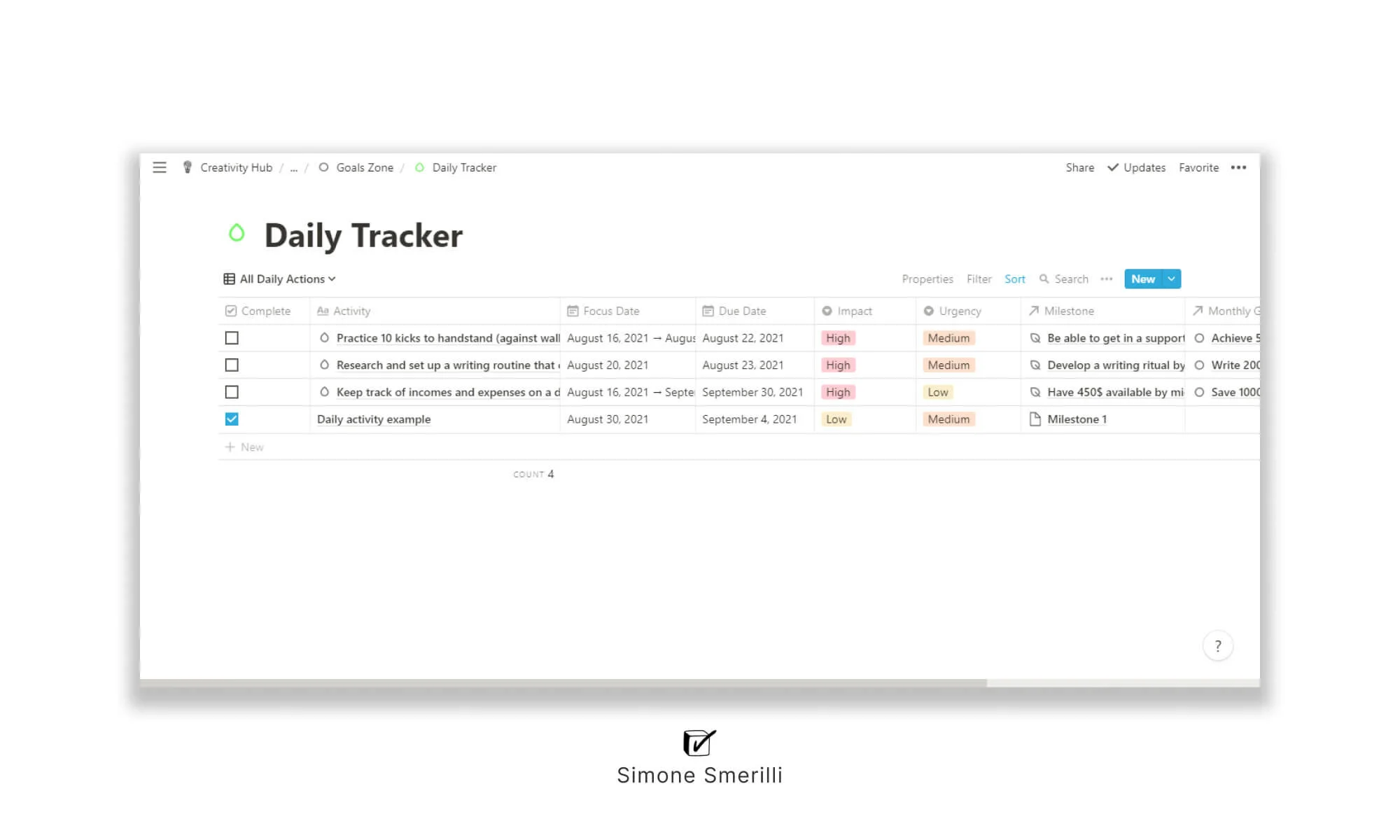 The last building block of the Goals Setting Notion system is the Daily Tracker. The daily tracker is where the action takes place. We could compare the daily tracking activity to tasks in a project management system. Daily activities are actionable, practical, concrete habits and tasks we need to complete to "keep on track" and achieve our broader yearly goals. Daily actions are a fundamental piece of this system. Habits play a fundamental role in achieving results. How we do anything is how we do everything. What we do defines who we are, to some degree, as the existentialists would argue. There is also a due date associated with daily actions. The Urgency and Importance "select-type" properties can help us define even more precisely every action.