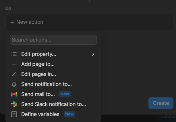 Notion Automations allow you to set up one or multiple triggers (using AND or OR operators) and one or multiple actions. The currently available actions include: