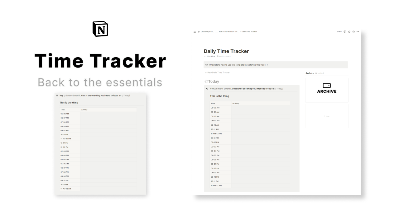 This Notion daily time tracking template uses the software's latest feature, Simple Tables, to unlock the power of intentional time allocation. There is one pillar behind it: keep it simple. By clicking the template button available at the top of the Notion template, you can generate a fresh new day to track. You will first be prompted with a fundamental question: what is the one thing you intend to focus on today? This is no trivial question. You will know the answer, even if the amount of endeavors you are juggling is significant. The one thing is that task/activity that moves the needle on something important. Even if it feels uncomfortable and complex, you know, deep down, the most important thing you should be doing. You are the hero in the hero's journey. You are also your worst enemy, the villain. Your capacity to develop self-limiting beliefs and cognitive distortions that lead you astray is infinite. And so is your potential. By using this time tracking tool, you may foster the latter part within you, trumping the former, one essential task at a time.
