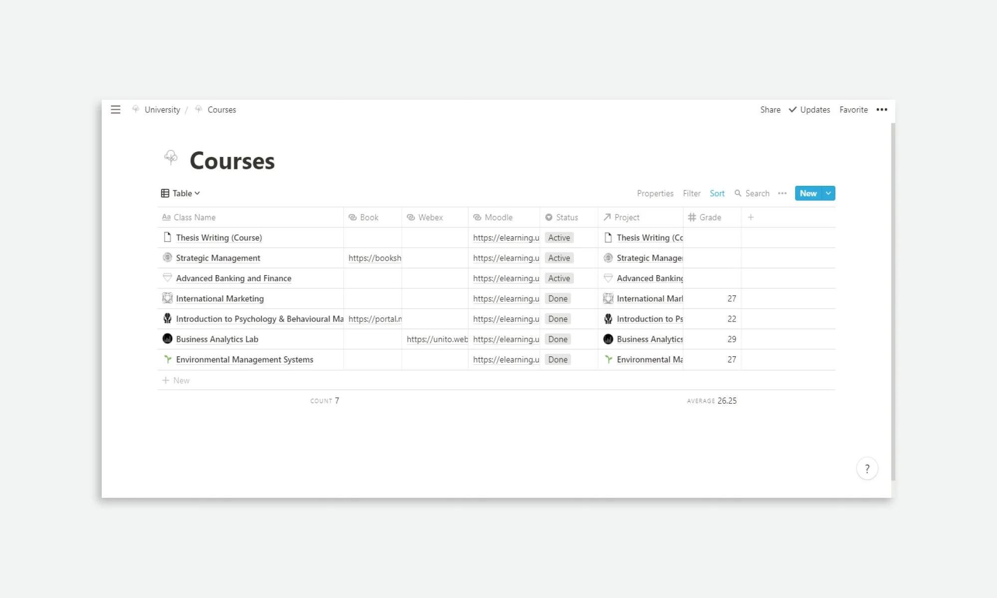 The Courses database is where university courses live. Each course has some link properties assigned to it, together with a status property (select) in order to categorize each learning as "active", "waiting for grade", or "completed", a relation property to a Project database, and a number property for keeping track of grades, whose average appears at the bottom of the column.